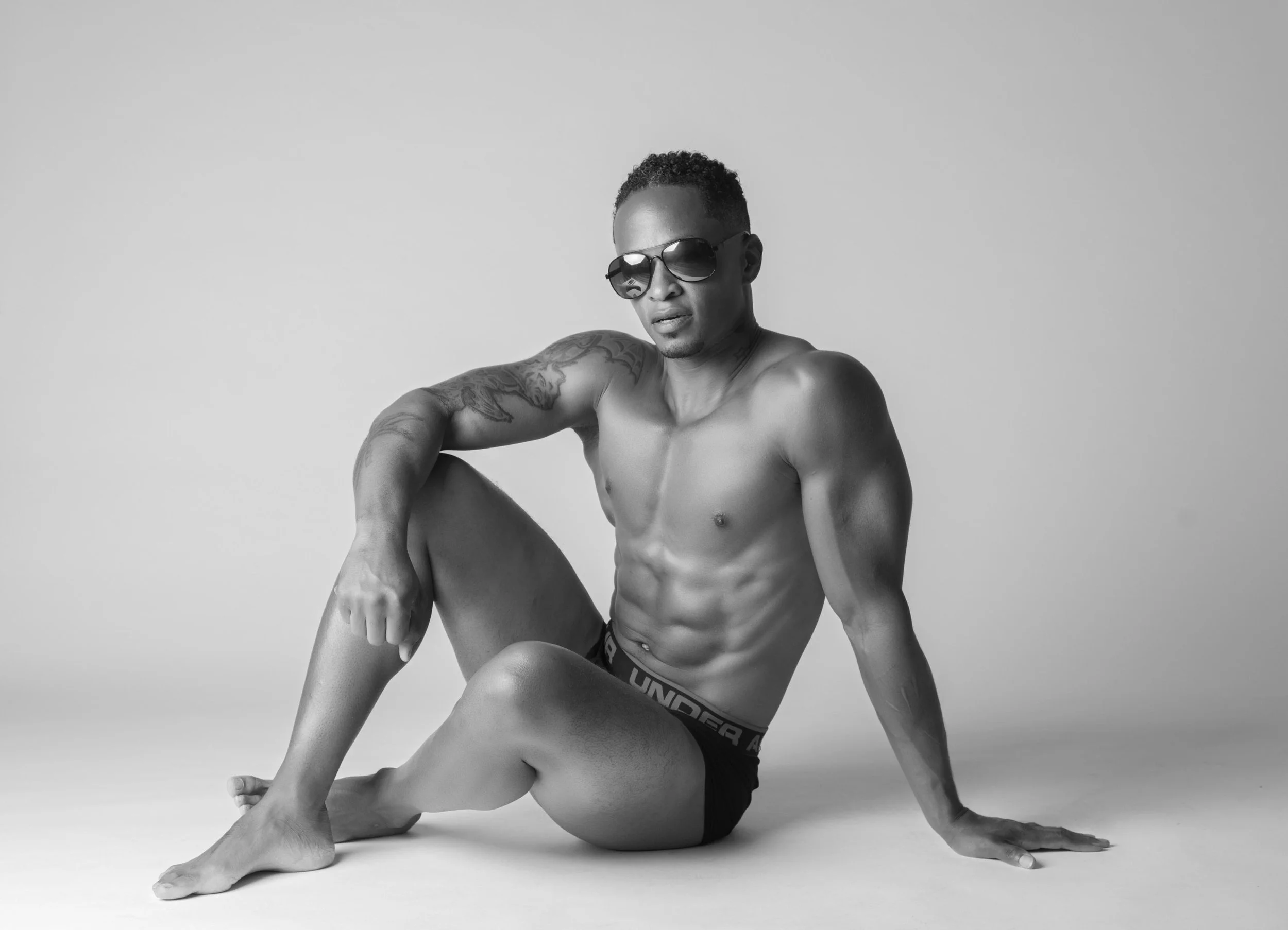 A shirtless man wearing sunglasses and underwear, sitting on the floor with one knee bent, posing against a plain background.